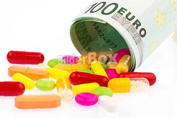 Beschreibung Ein 100 Euroschein und Tabletten auf weißem Hintergrund.