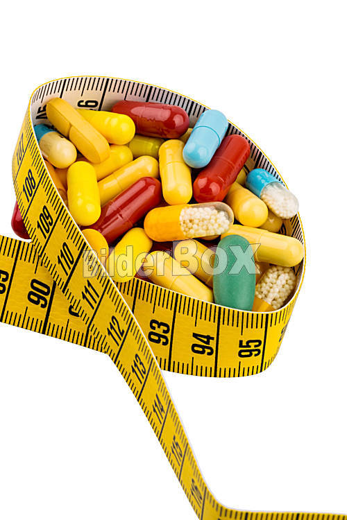 Beschreibung Tabletten und Maßband, Symbolfoto für Appetitzügler, Diätpillen und Schlankheitswahn
