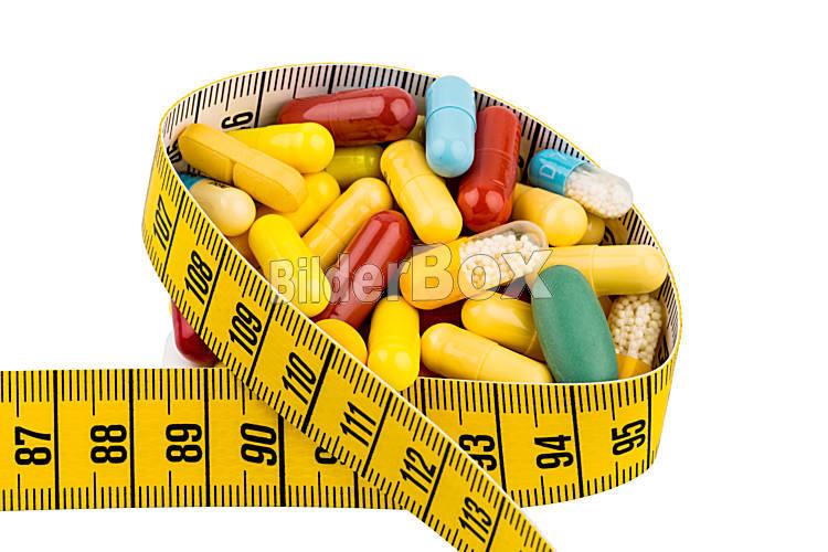 Beschreibung Tabletten und Maßband, Symbolfoto für Appetitzügler, Diätpillen und Schlankheitswahn