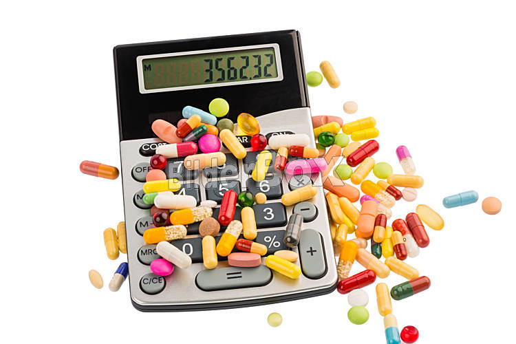 Beschreibung Tabletten liegen auf einem Taschenrechner. Symbolfoto für Kosten in der Medizin und Pharmaindustrie