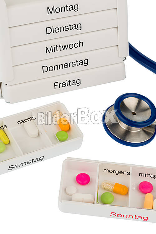 Beschreibung Tablettenspender und Stethoskop, Symbolfoto für Therapie, Verordnung und Herzinfarkt