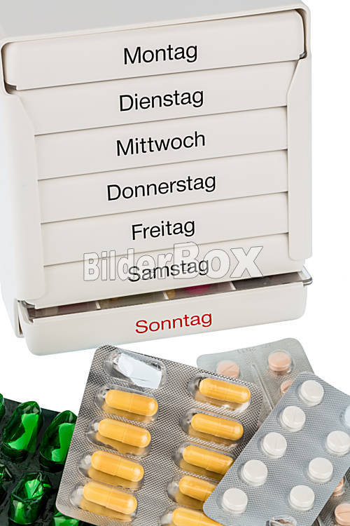 Beschreibung Tablettenspender und Tabletten, Symbolfoto für Therapie, Verordnung, Dosierung