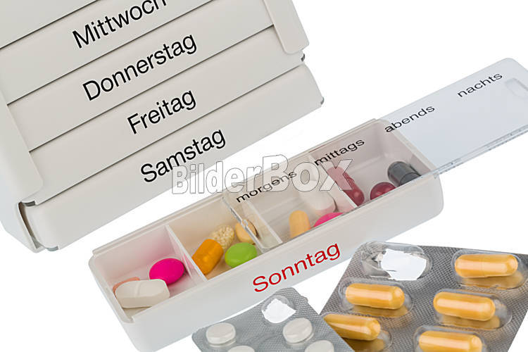 Beschreibung Tablettenspender und Tabletten, Symbolfoto für Therapie, Verordnung, Dosierung