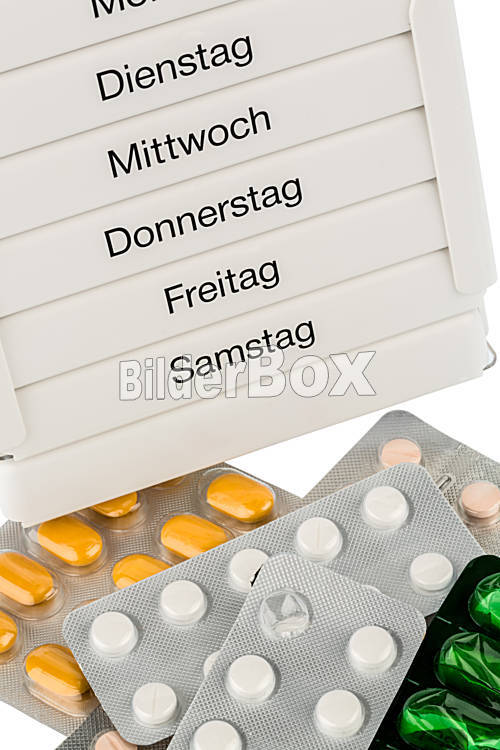 Beschreibung Tablettenspender und Tabletten, Symbolfoto für Therapie, Verordnung, Dosierung