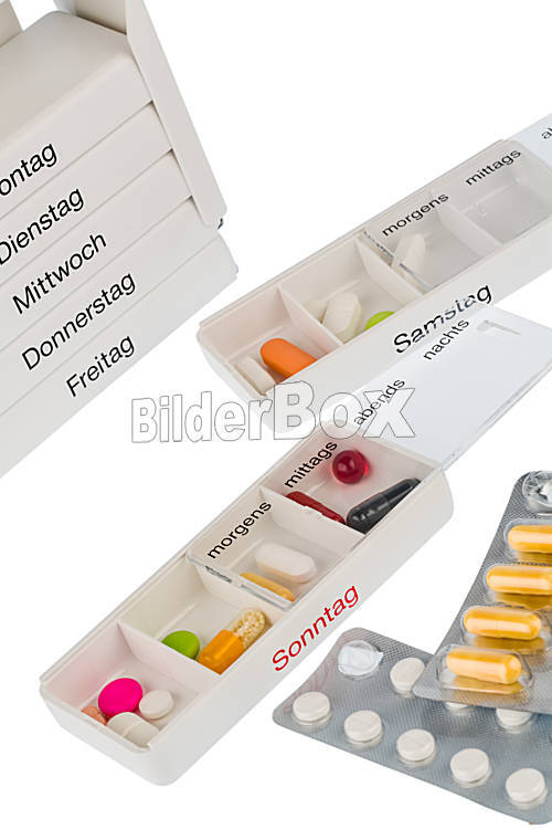 Beschreibung Tablettenspender und Tabletten, Symbolfoto für Therapie, Verordnung, Dosierung