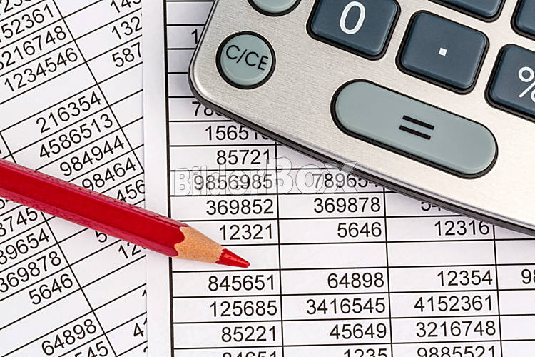 Beschreibung Ein Taschenrechner liegt auf den Zahlen einer Bilanz uns Statistik. Symbolphoto für Umsatz, Gewinn und Kosten.