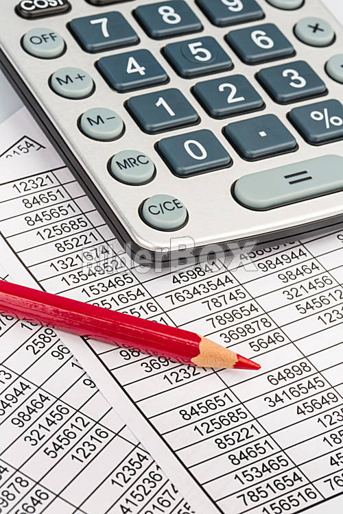 Beschreibung Ein Taschenrechner liegt auf den Zahlen einer Bilanz uns Statistik. Symbolphoto für Umsatz, Gewinn und Kosten.