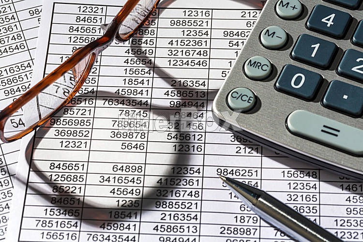 Beschreibung Ein Taschenrechner liegt auf den Zahlen einer Bilanz uns Statistik. Symbolphoto für Umsatz, Gewinn und Kosten.