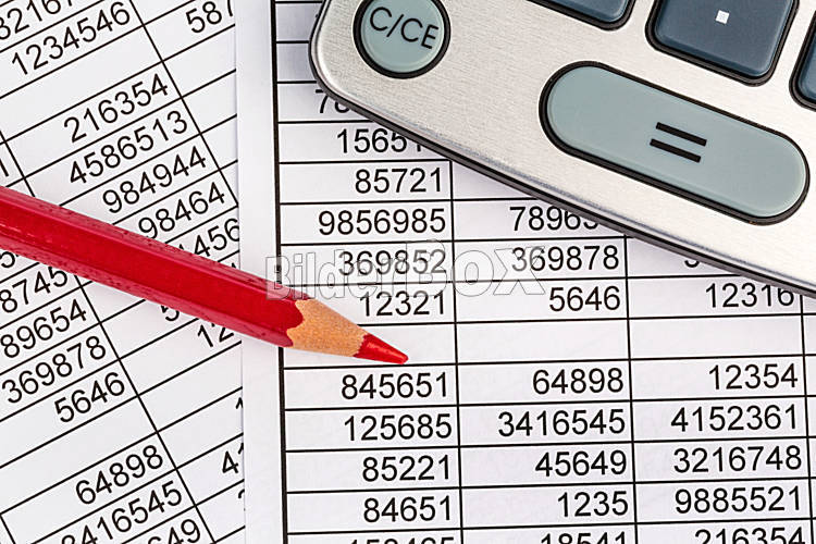 Beschreibung Ein Taschenrechner liegt auf den Zahlen einer Bilanz uns Statistik. Symbolphoto für Umsatz, Gewinn und Kosten.