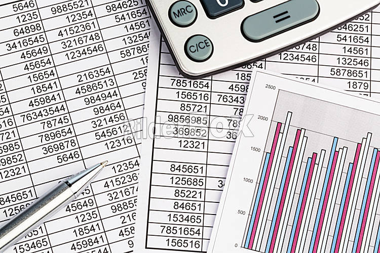 Beschreibung Ein Taschenrechner liegt auf den Zahlen einer Bilanz uns Statistik. Symbolphoto für Umsatz, Gewinn und Kosten.
