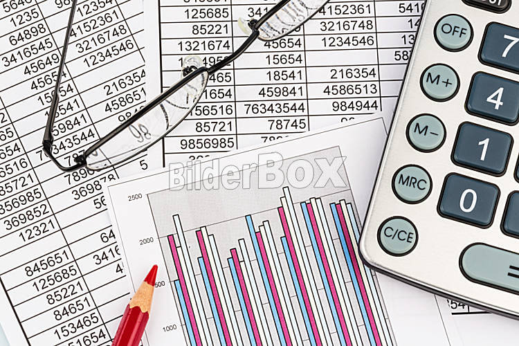 Beschreibung Ein Taschenrechner liegt auf den Zahlen einer Bilanz uns Statistik. Symbolphoto für Umsatz, Gewinn und Kosten.