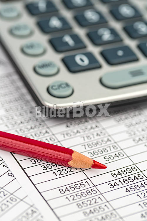 Beschreibung Ein Taschenrechner liegt auf den Zahlen einer Bilanz uns Statistik. Symbolphoto für Umsatz, Gewinn und Kosten.