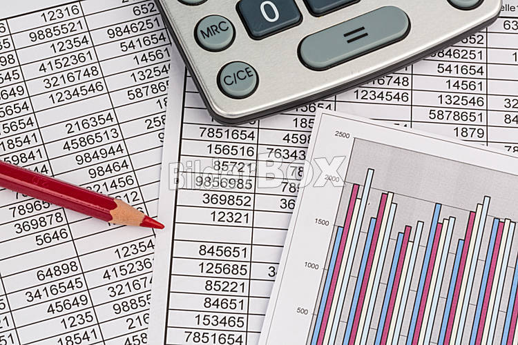 Beschreibung Ein Taschenrechner liegt auf den Zahlen einer Bilanz uns Statistik. Symbolphoto für Umsatz, Gewinn und Kosten.