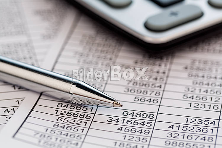 Beschreibung Ein Taschenrechner liegt auf den Zahlen einer Bilanz uns Statistik. Symbolphoto für Umsatz, Gewinn und Kosten.