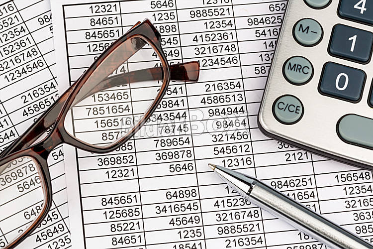 Beschreibung Ein Taschenrechner liegt auf den Zahlen einer Bilanz uns Statistik. Symbolphoto für Umsatz, Gewinn und Kosten.