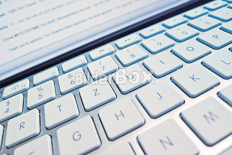 Beschreibung Die Tastatur eines Computers vor einem Bildschirm. Datenverarbeitung und Internet