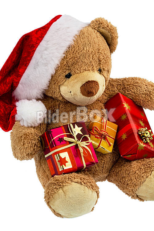 Beschreibung Ein Teddybär mit Geschenken zu Weihnachten. Als Weihnachtsmann verkleidet.