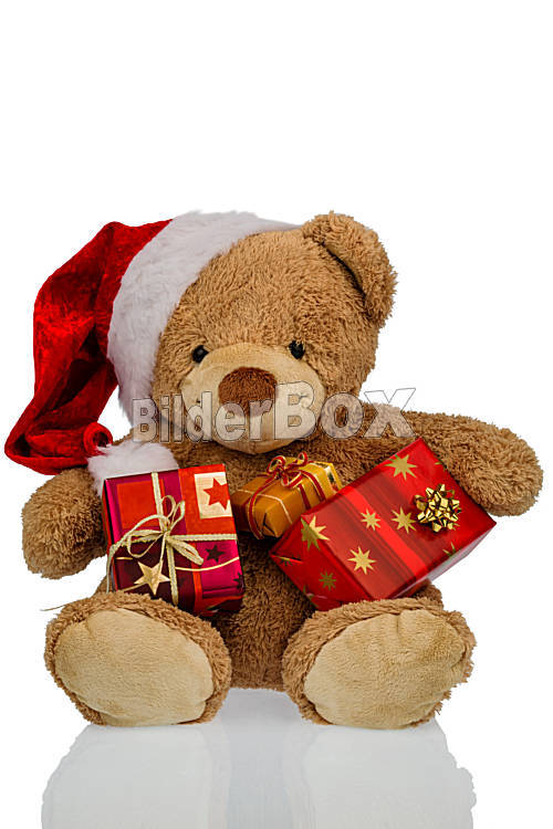Beschreibung Ein Teddybär mit Geschenken zu Weihnachten. Als Weihnachtsmann verkleidet.