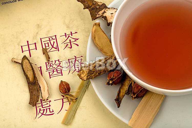 Beschreibung Zutaten für einen Tee in der traditionellen chinesischen Medizin. Heilung von Krankheiten durch alternative Methoden.