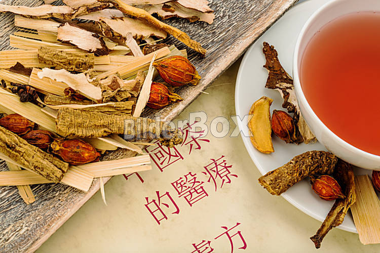 Beschreibung Zutaten für einen Tee in der traditionellen chinesischen Medizin. Heilung von Krankheiten durch alternative Methoden.