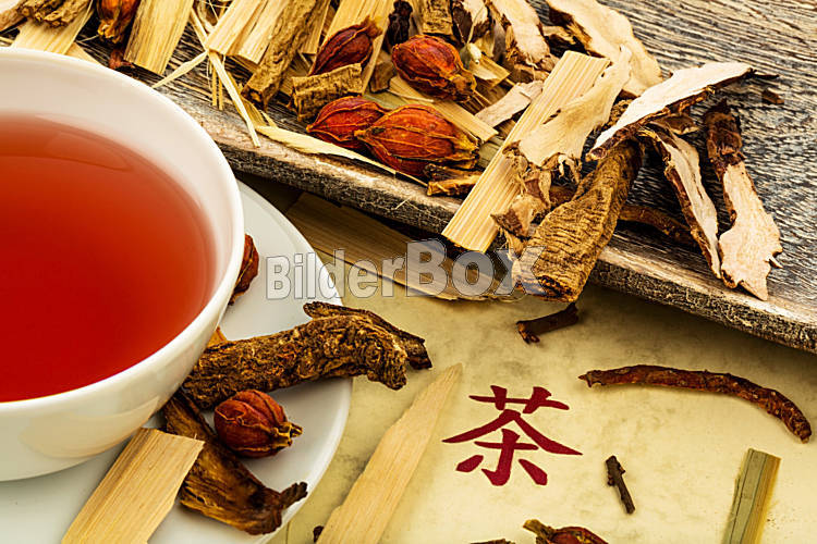 Beschreibung Zutaten für einen Tee in der traditionellen chinesischen Medizin. Heilung von Krankheiten durch alternative Methoden.