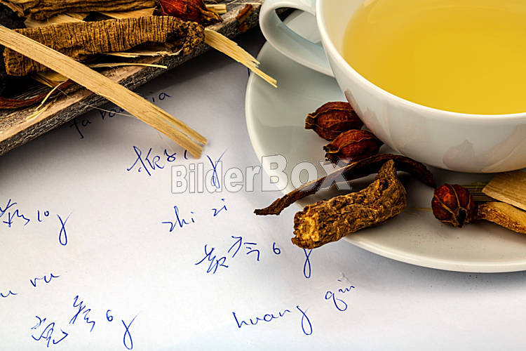 Beschreibung Zutaten für einen Tee in der traditionellen chinesischen Medizin. Heilung von Krankheiten durch alternative Methoden.