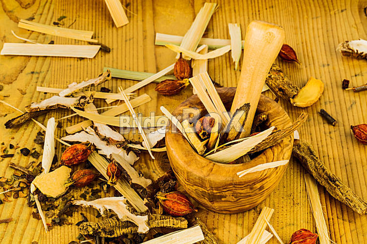 Beschreibung Zutaten für einen Tee in der traditionellen chinesischen Medizin. Heilung von Krankheiten durch alternative Methoden.