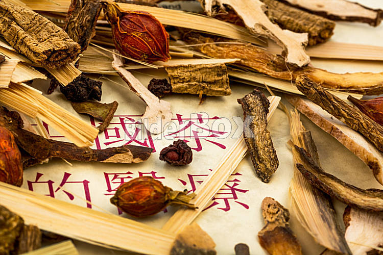 Beschreibung Zutaten für einen Tee in der traditionellen chinesischen Medizin. Heilung von Krankheiten durch alternative Methoden.