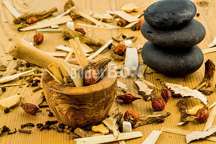Beschreibung Zutaten für einen Tee in der traditionellen chinesischen Medizin. Heilung von Krankheiten durch alternative Methoden.