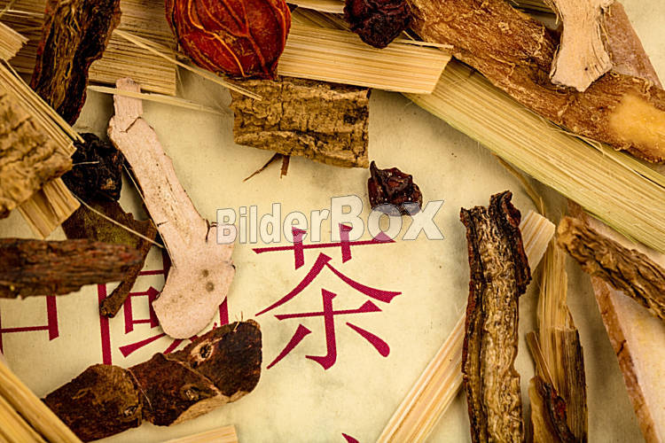 Beschreibung Zutaten für einen Tee in der traditionellen chinesischen Medizin. Heilung von Krankheiten durch alternative Methoden.