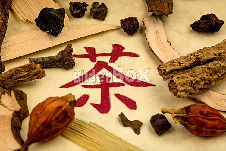 Beschreibung Zutaten für einen Tee in der traditionellen chinesischen Medizin. Heilung von Krankheiten durch alternative Methoden.