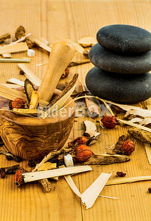Beschreibung Zutaten für einen Tee in der traditionellen chinesischen Medizin. Heilung von Krankheiten durch alternative Methoden.