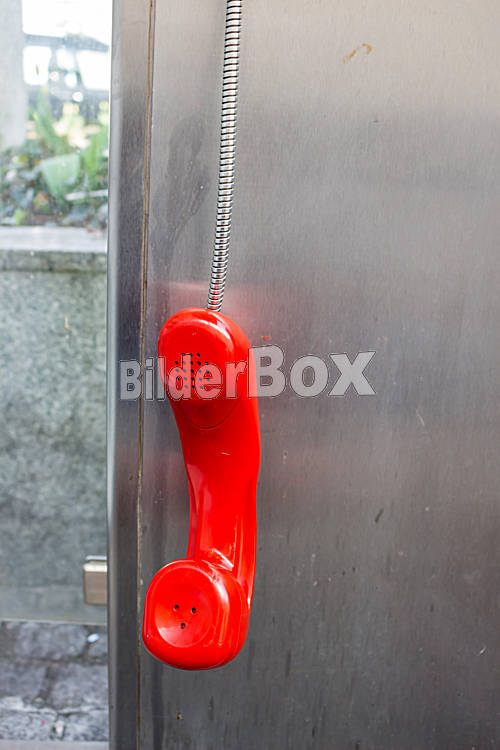 Beschreibung Eine Telefonzelle der Telekom in Österreich mit rotem Telefonhörer