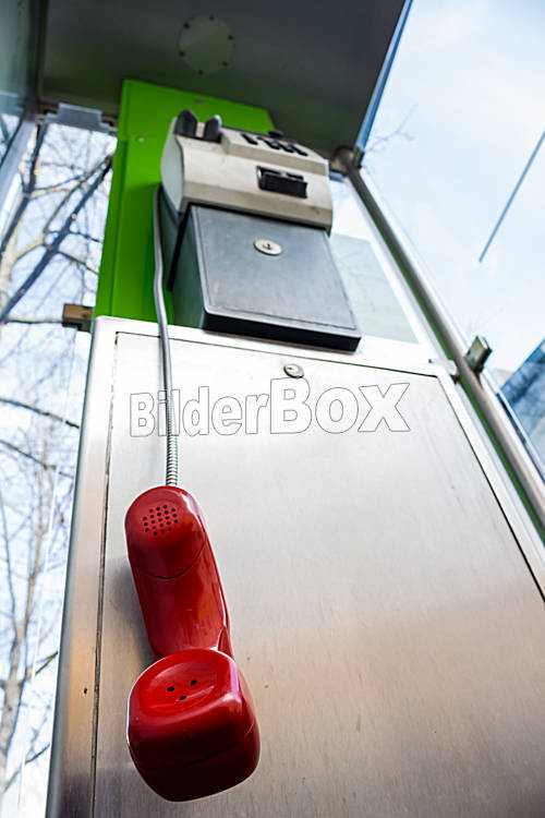 Beschreibung Eine Telefonzelle der Telekom in Österreich mit rotem Telefonhörer