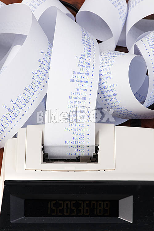 Tischrechner mit Rechenstreifen für Kosten, Ausgab