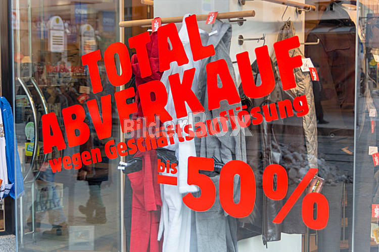 Beschreibung Total Abverkauf wegen Geschäftsauflösung. Symbolfoto für Konkurs und Pensionierung.