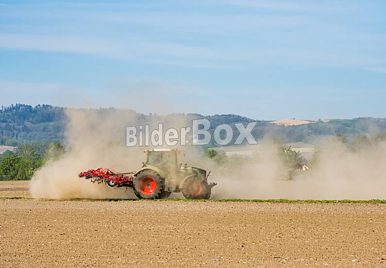 Beschreibung Ein Landwirt bestellt mit einer Zugamschine sein ausgetrocknetes Feld während einer Trockenperiode. Österreich, OÖ, Bezirk Eferding