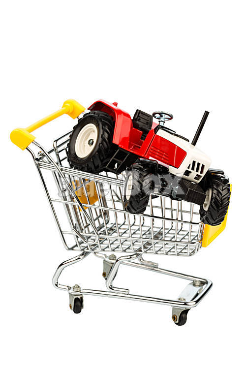 Beschreibung Ein Traktor in Einkaufswagen als Symbol für den Kauf eines neuen landwirtschaftlichen Gerätes
