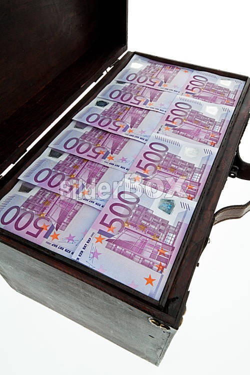 Beschreibung Eine große Truhe mit Euro Banknoten. Finanzkrise, Krise, Schulden.