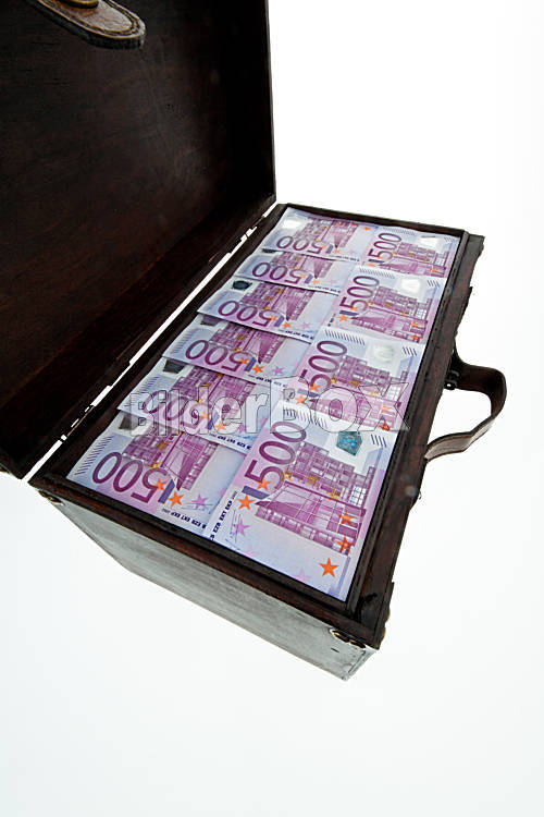 Beschreibung Eine große Truhe mit Euro Banknoten. Finanzkrise, Krise, Schulden.