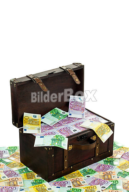 Beschreibung Eine große Truhe mit Euro Banknoten. Finanzkrise, Krise, Schulden.