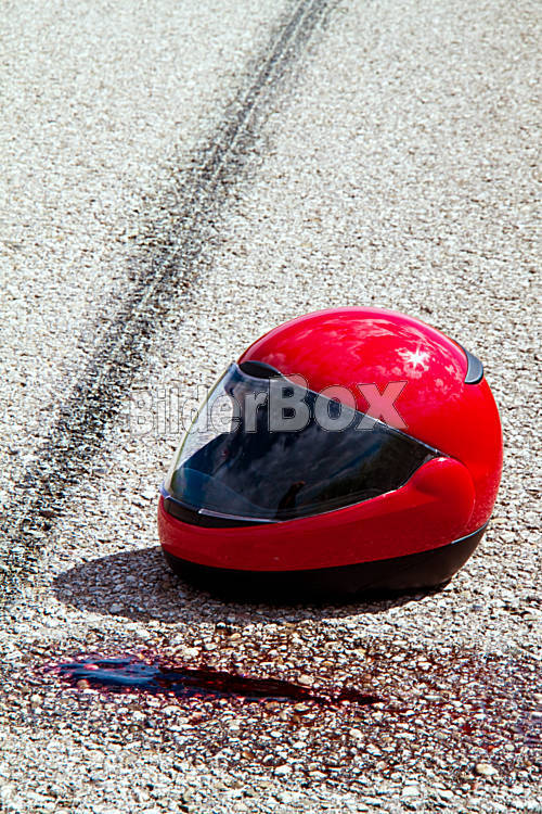 Beschreibung Ein Unfall mit Motorrad. Verkehrsunfall mit Bremsspur auf Strasse. Symbolfoto.
