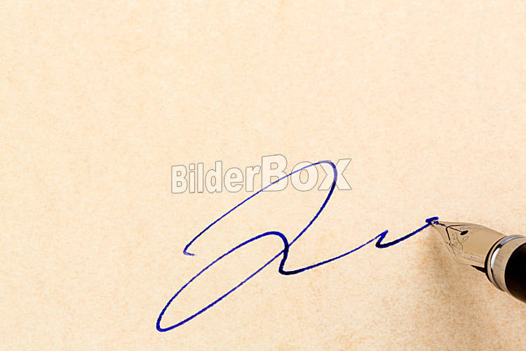 Beschreibung Ein Vertrag oder Schriftstück wird mit einem Füllhalter eigenhändig unterschrieben.