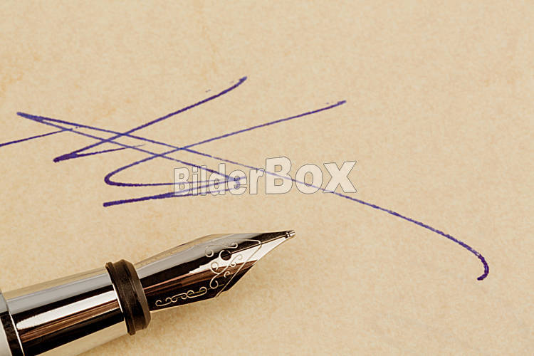 Beschreibung Ein Vertrag oder Schriftstück wird mit einem Füllhalter eigenhändig unterschrieben.