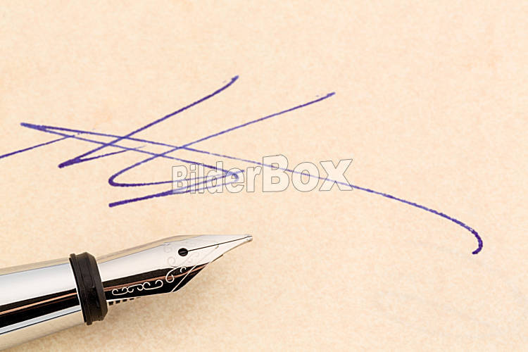Beschreibung Ein Vertrag oder Schriftstück wird mit einem Füllhalter eigenhändig unterschrieben.
