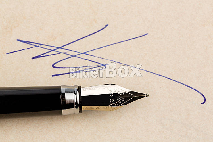 Beschreibung Ein Vertrag oder Schriftstück wird mit einem Füllhalter eigenhändig unterschrieben.