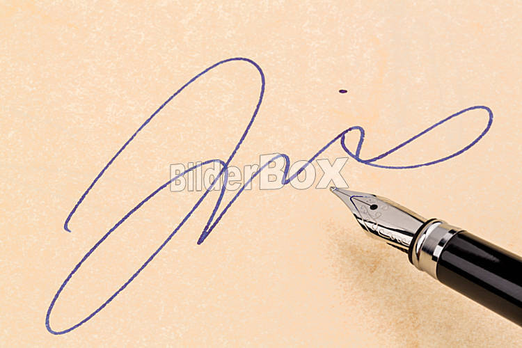 Beschreibung Eine Unterschrift und ein Füllhalter auf gelben Papier. Symbolfoto für Vertrag, Testament und Grafologie