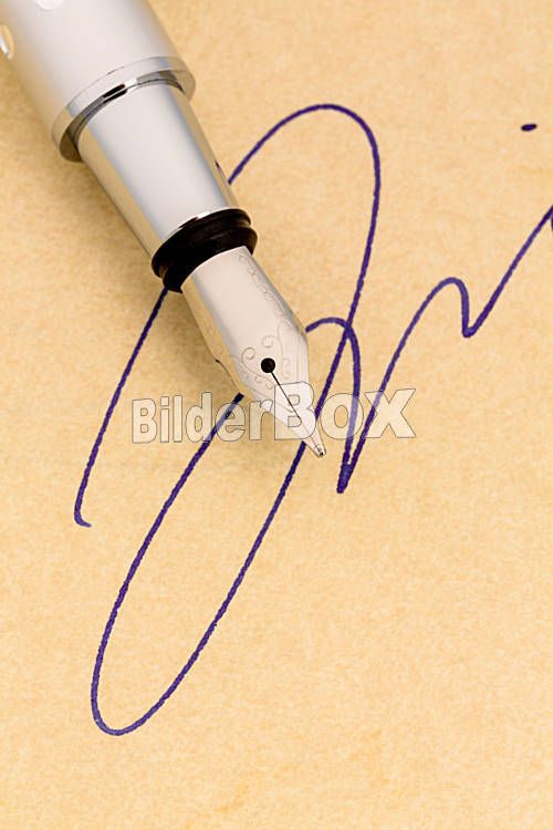 Beschreibung Eine Unterschrift und ein Füllhalter auf gelben Papier. Symbolfoto für Vertrag, Testament und Grafologie