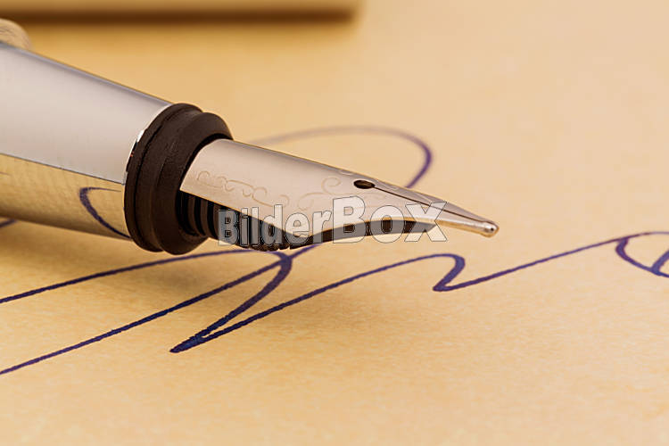 Beschreibung Eine Unterschrift und ein Füllhalter auf gelben Papier. Symbolfoto für Vertrag, Testament und Grafologie