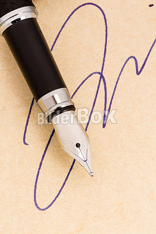 Beschreibung Eine Unterschrift und ein Füllhalter auf gelben Papier. Symbolfoto für Vertrag, Testament und Grafologie